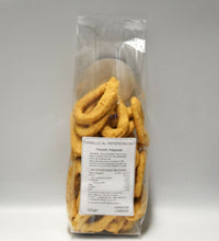 Ingredienti : farina di GRANO tenero 0,vino bianco (contiene SOLFITI),olio extravergine d’oliva,olio di girasole alto oleico,sale,peperoncino in polvere 0,73%, zucchero di canna,bicarbonato di sodio. Può contenere tracce di SOIA,SENAPE e LUPINI.