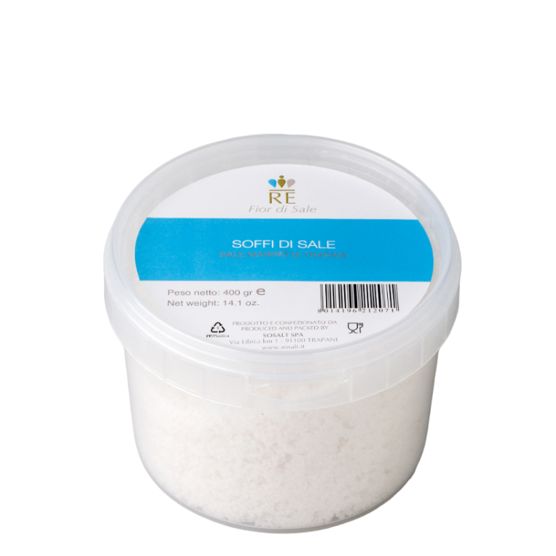 Raccolti a mano dai salinai con grande maestria, secondo un'antica tradizione millenaria, i Soffi di Sale si distinguono per la loro granulometria finissima naturale, ottenuta senza alcuna macinazione meccanica.