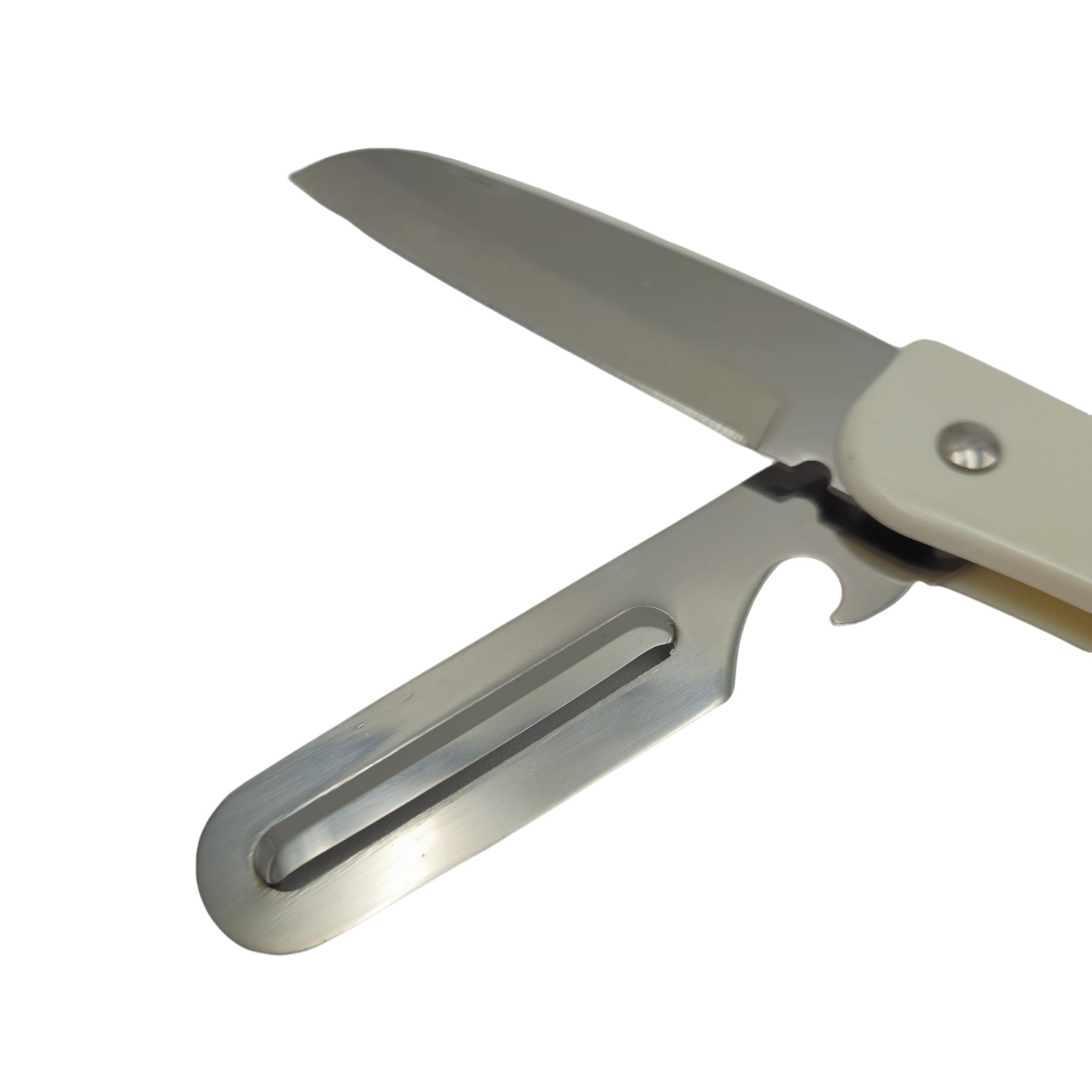 Esperto coltello per frutta e verdura con doppia funzione di sbucciare e tagliare, dispone anche di un comodo pelatutto pieghevole e apribottiglie incluso. Realizzato in resistente acciaio inossidabile per un'efficace e veloce preparazione di gustose pietanze.