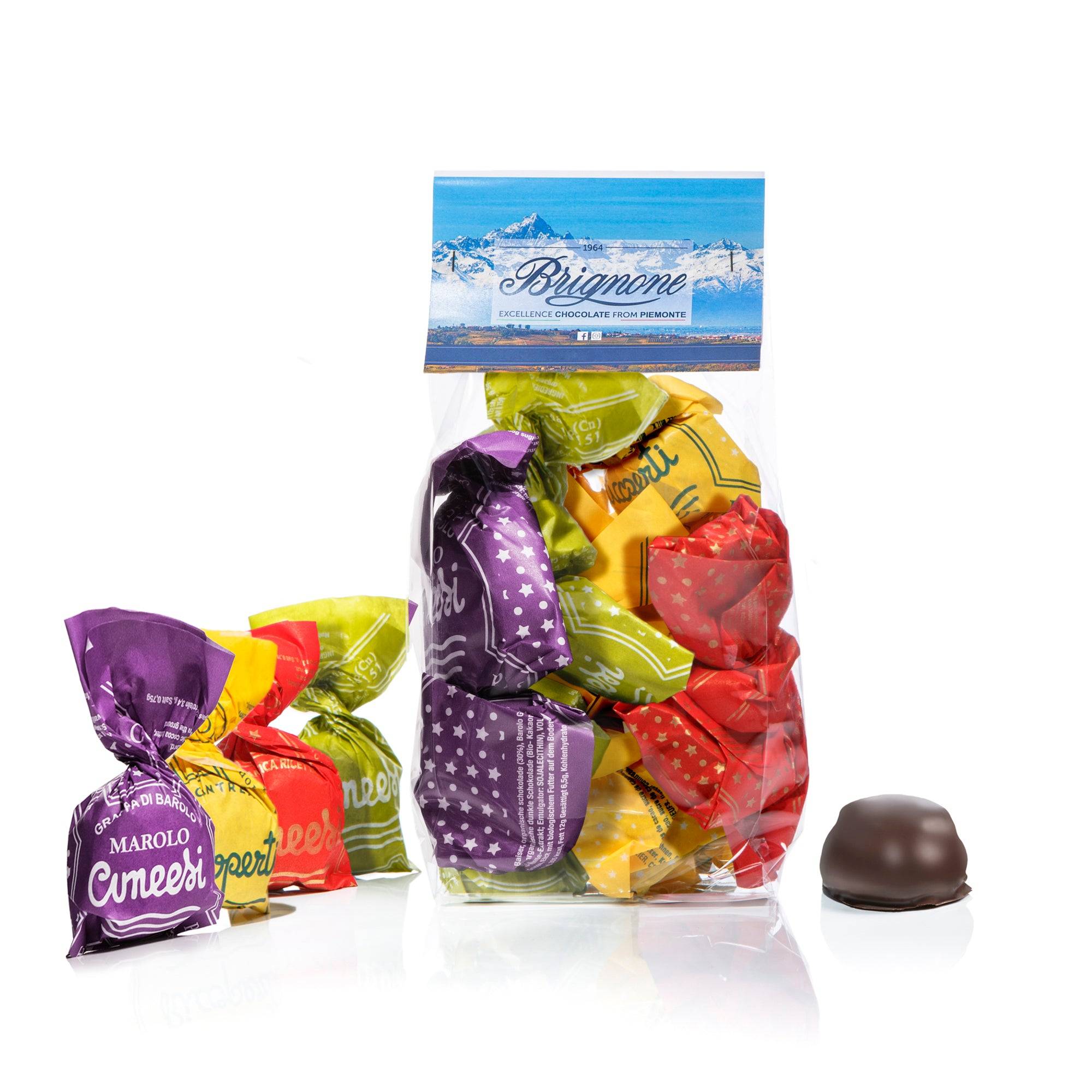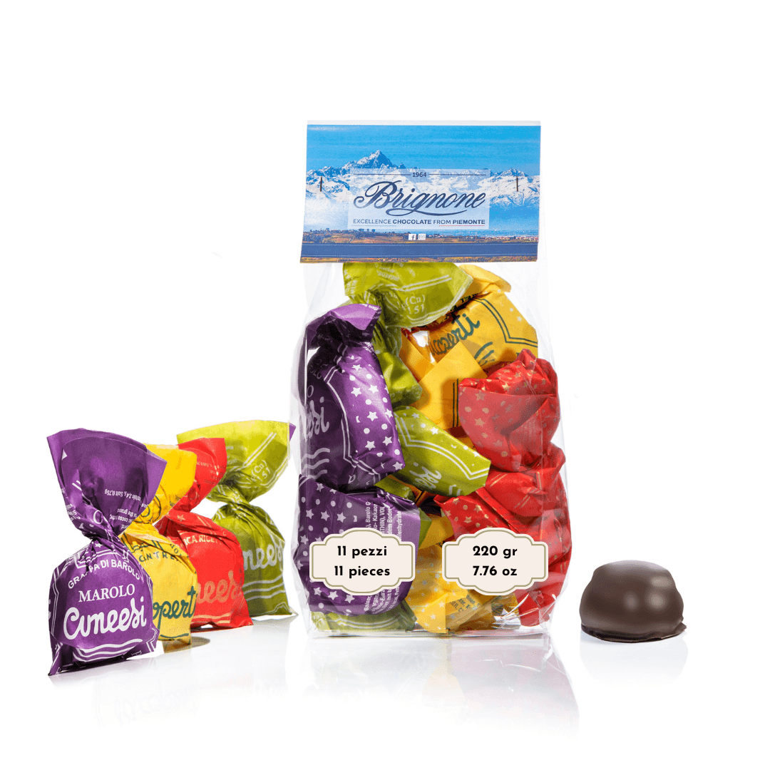 Esplora la diversità dei sapori con i nostri Cuneesi Misti, una selezione esclusiva che celebra l'arte pasticcera della Pasticceria Brignone. Ogni confezione racchiude un assortimento di cioccolatini artigianali, con Rum, Genepì, Cointreau e Grappa di Barolo, offrendoti un viaggio gustativo attraverso i liquori più raffinati e le tradizioni delle nostre vallate. Questa collezione unica è il risultato di tecniche artigianali tramandate da tre generazioni, che esaltano l'eccellenza e la diversità dei dolci piemontesi tipici