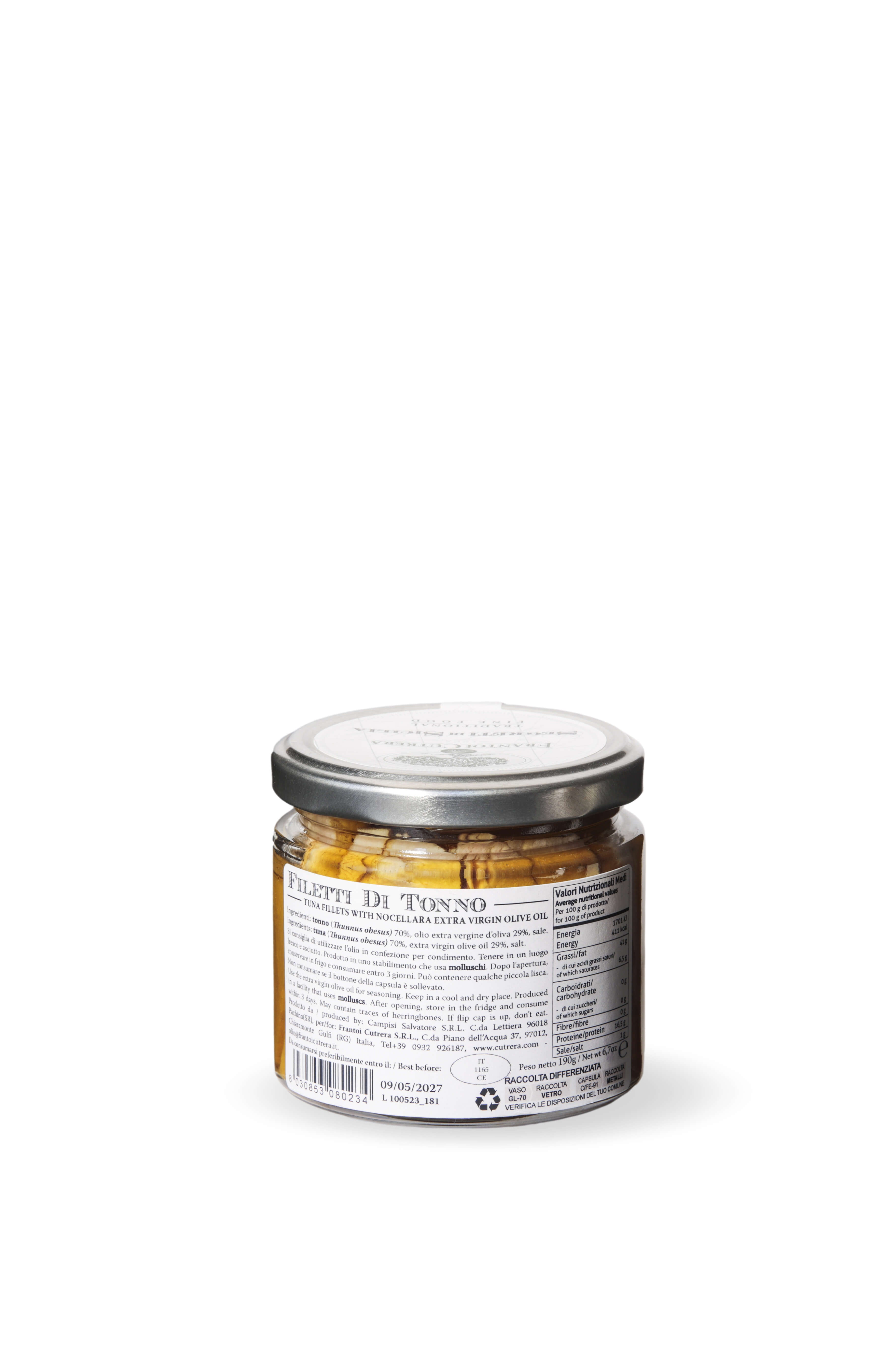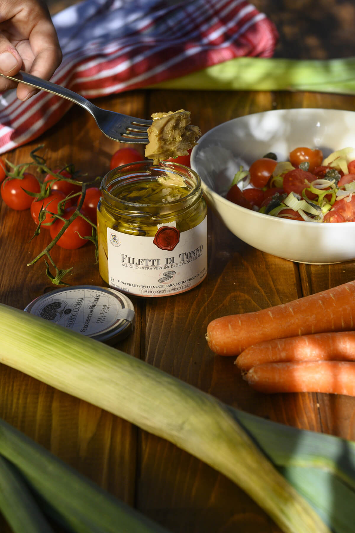 Il nostro tonno pinna gialla viene lavorato a mano e conservato in olio extra vergine di oliva Nocellara per garantirne la migliore conservazione ed esaltarne il sapore.