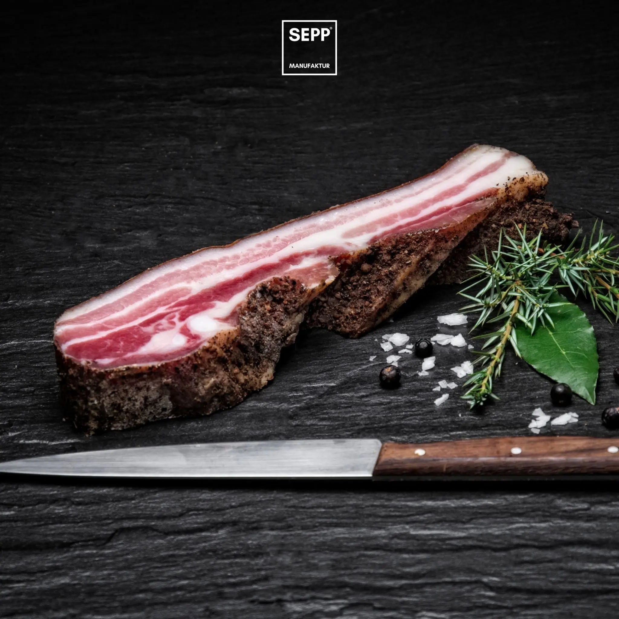 Il meglio del fianco, della pancia e del carré viene unito nello Speck di Pancetta di SEPP. Viene tradizionalmente salato e speziato a mano e poi affumicato su legno di faggio e bacche di ginepro. Infine, gli è permesso di stagionare per diversi mesi nell'aria di montagna, speziata e aspra.