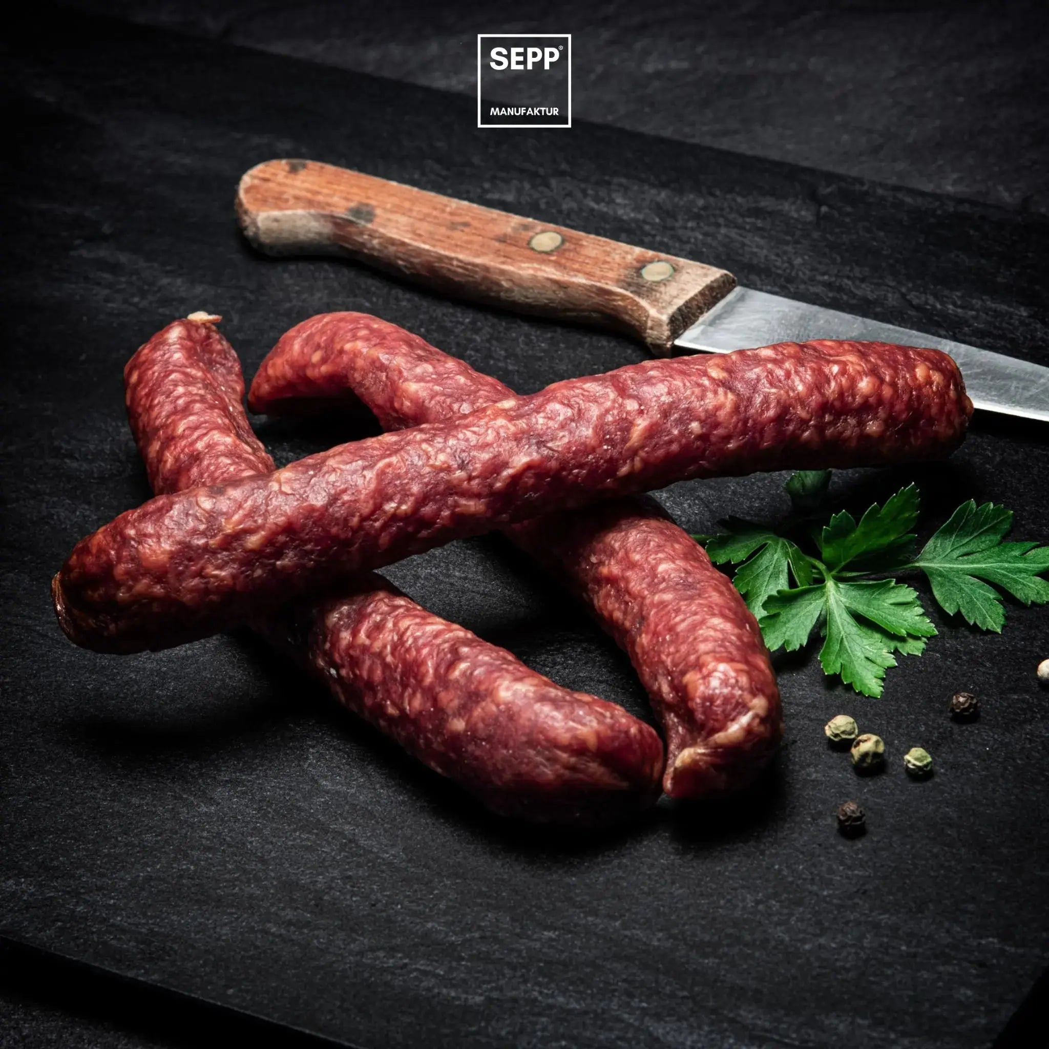 Le Salsicce affumicate SEPP al capriolo (salamini affumicati da camino) a base di carne di capriolo e carne di maiale (Vulkanlandschwein / Marchio di qualità AMA), sono una specialità per gli amanti dei sapori più raffinati. Chiamati tradizionalmente Kaminwurzen, vengono realizzati con carne finemente condita, affumicata e stagionata.