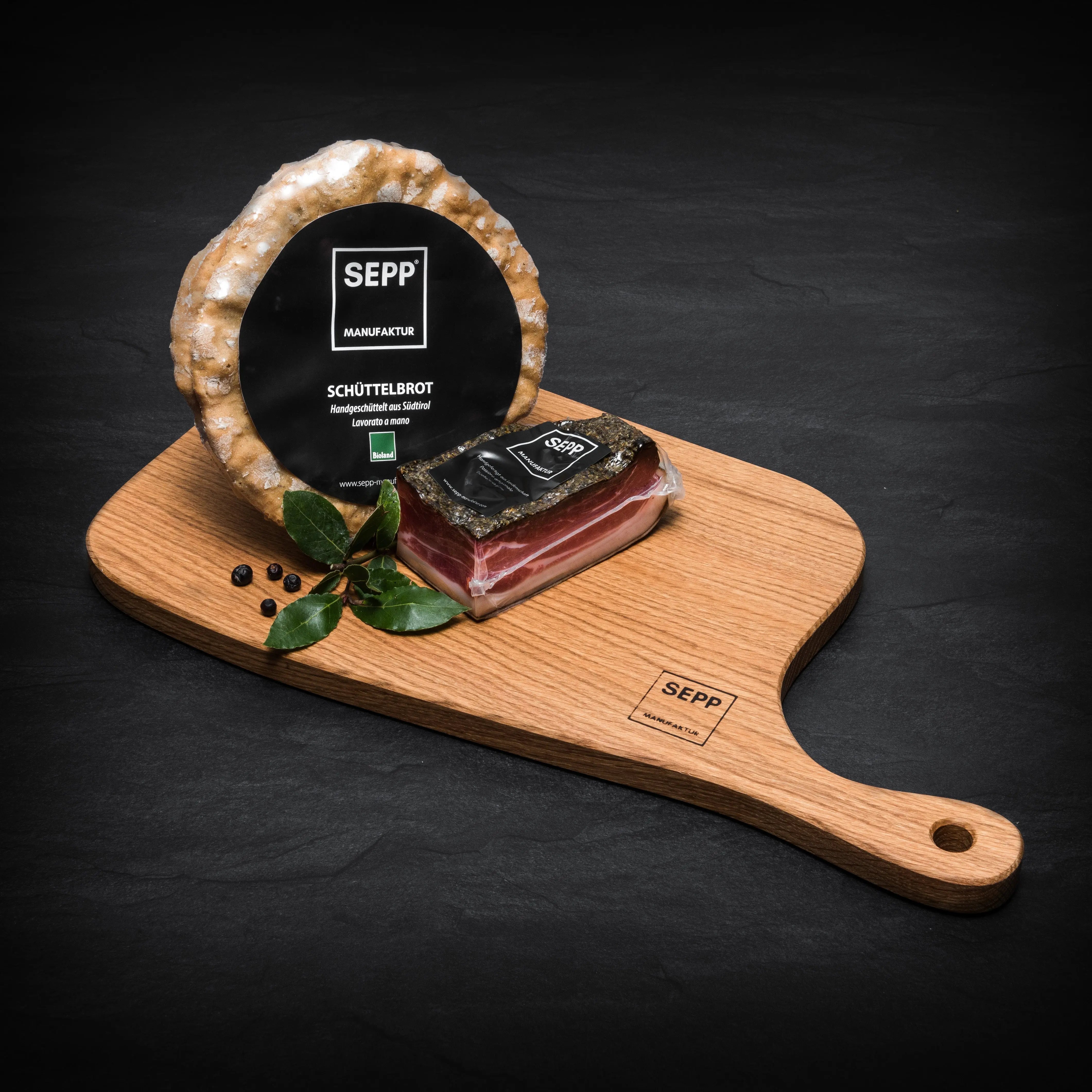 La SEPP'Südtiroler Marende piccola incl. tavola per speck in rovere massiccio, ideale come regalo o da regalare a se stessi! Quando la tradizione incontra il design.